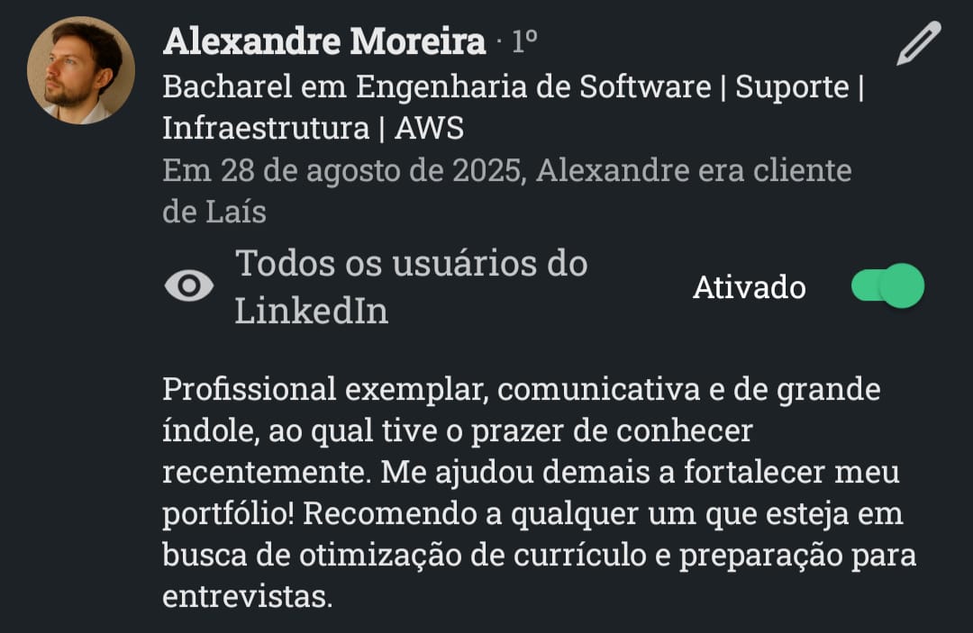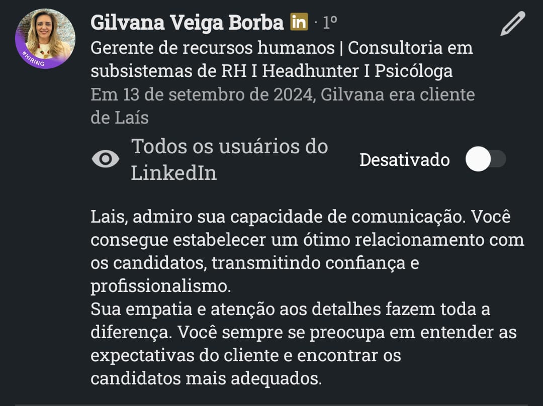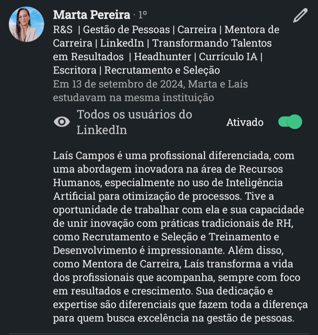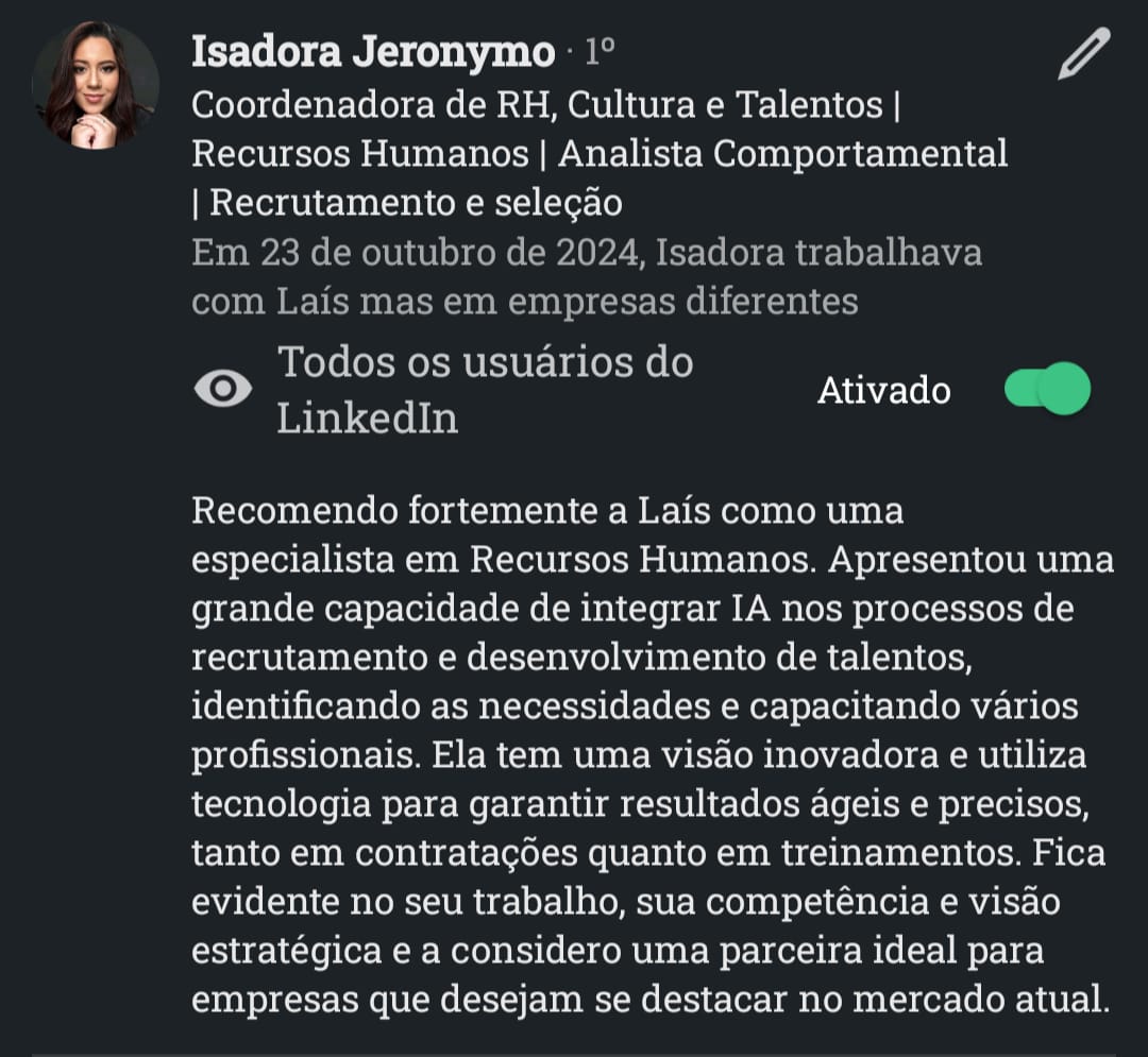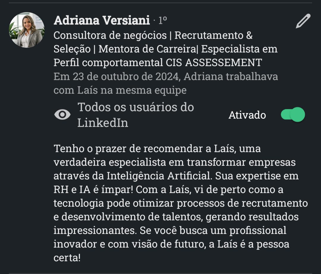 Com atuação em Recrutamento & Seleção por Competências, mentoria de carreiras, treinamentos corporativos e aplicação de IA no RH.